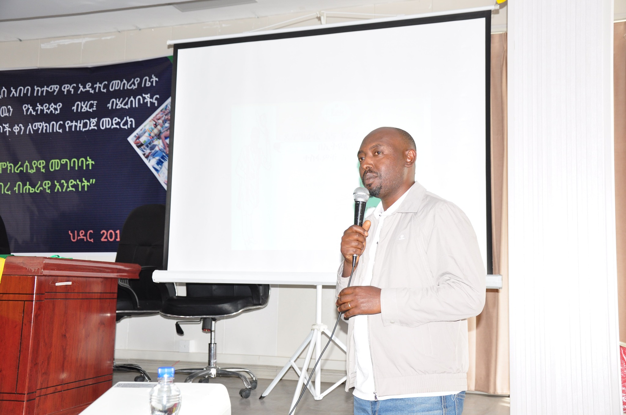 ለተሳታፊዎች የመወያያ ሰነድ ያቀረቡት የኮልፌ ክ/ከተማ የብሊክ ሰርቪስና ሰው ሀብት ልማት ት/ቤት የማስፈፀም የአቅም ግንባታ ስራዎች አስተባሪ አቶ ፍቃዱ ቀቀባ አስተባባሪ እንዳሉት የኢትዮጵያ ብሔሮች፣ ብሔረሰቦችና ሕዝቦች መብት መከበር ሕገ መንግሥታዊ ዋስትና ያረጋገጠው የኢፌዲሪ ሕገ-መንግሥት የጸደቀበትን ቀን ህዳር 29 በየዓመቱ በተለያዩ ሁነቶች ላለፉት 19 ዓመታት ሲከበር መቆየቱን አስታውሰው በዚህ አመት “ዴሞክራሲያዊ መግባባት ለኅብረ ብሔራዊ አንድነት” በሚል መሪ ቃል ለ20ኛ ግዜ የሚከበረው የኢትዮጵያ ብሔሮች፣ ብሔረሰቦችና ሕዝቦች ቀን በዓል ሲከበር በአገራችን ዴሞክራሲያዊ ፌዴራላዊ ሥርዐት ማእቀፍ የተገነባ ኅብረ ብሔራዊ አንድነት ሥር እንዲሰድና እንዲዳብር ማደረግን አላማ ያደረገ ነው ብለዋል፡፡
